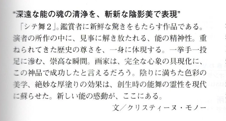 能舞台を主題に幻想的な画面を作り上げる作者。今作の左右には中作品の「シテ舞1・2」が置か